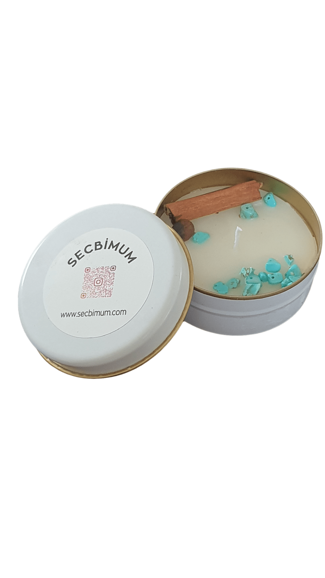 • AçıklamaTeneke kutu mumumuzun çapı 7X6 cm 93 gr ağırlığındadırTeneke kutu mum kabımız soya wax mum ile doldurulmuştur. Beyaz mum üzerine turkuaz taşı ve tarçın ile süslenmiştirTurkuaz TaşıKişiye şans ve uğur getirdiği bilinmektedirNazara karşı koruyucu bir etkisi vardırTansiyonu dengelerKaygı duygusuna k...
