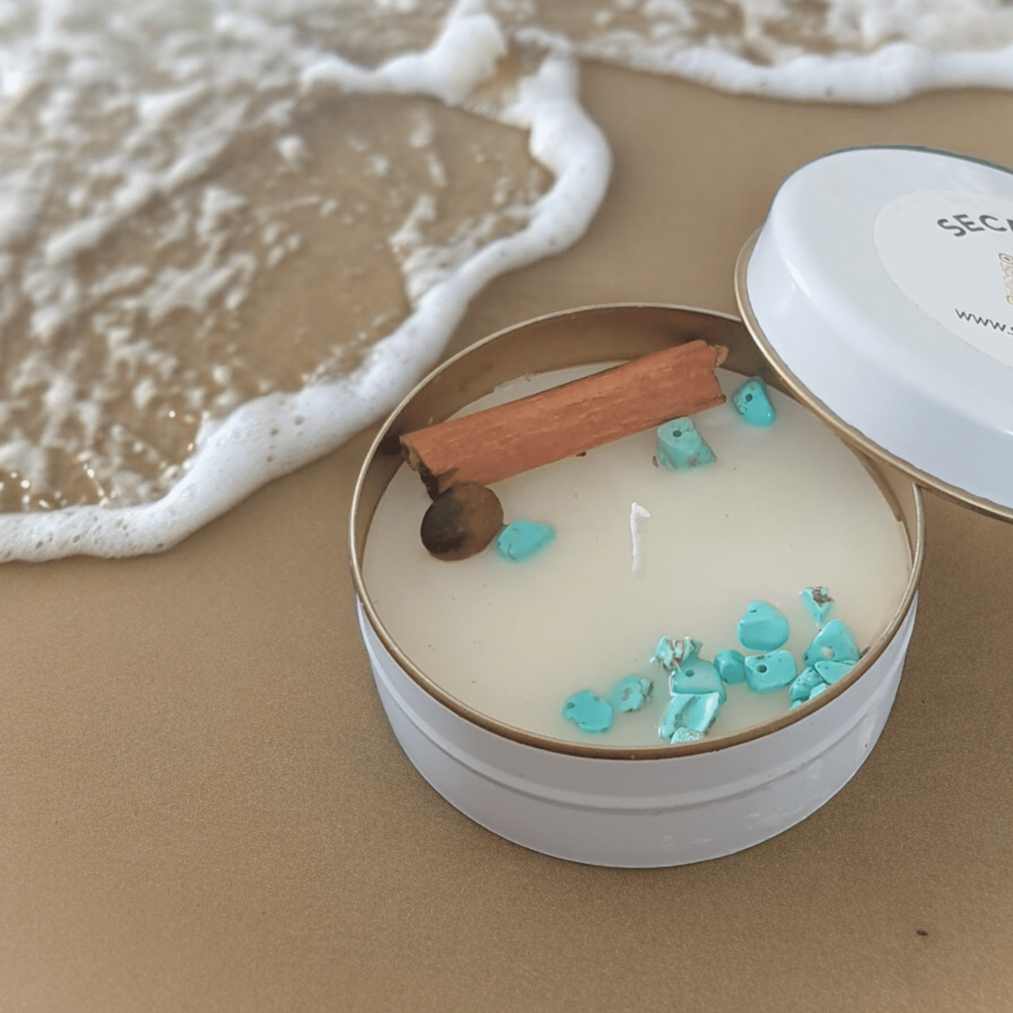 Beyaz mum üzerine turkuaz taşı ve tarçın ile süslenmiştir